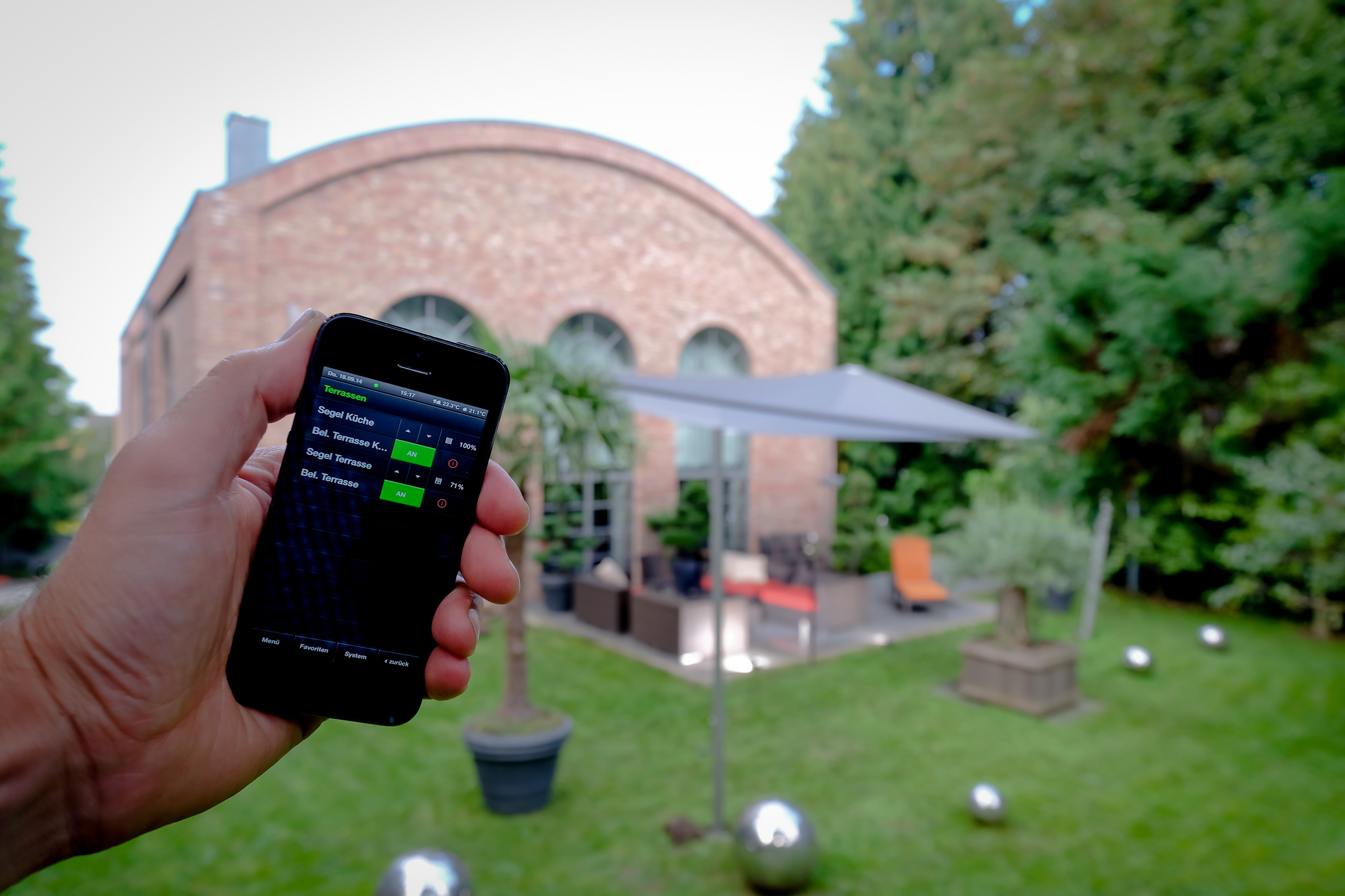 Zum Verständnis: Wenn Sie Ihr Sonnensegel, Ihre Markise oder Ihre Rollläden über Smartphone fernsteuern, bedeutet dies im Klartext, dass Sie die Zentrale mit Ihrem Smartphone ansteuern. Das Smartphone greift also nicht auf die Aktoren und Sensoren zu, sondern nur auf die Zentrale.