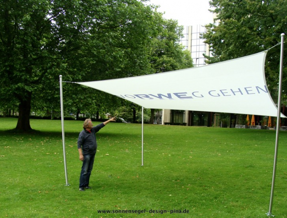 System mit 3 Masten/ 1 Wandbefestigung / 1 Höheneinstellung. Ausgestattet mit einem wasserabweisendem Tuch, aus einem acrylatbeschichtetem Polyestergewebe.