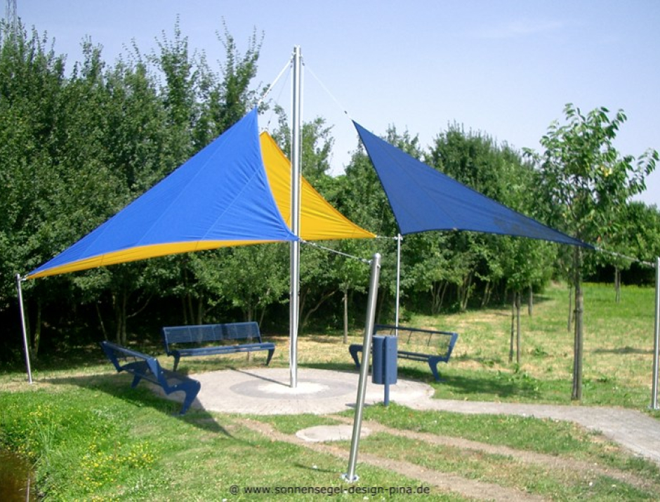 System mit 3 Masten. Ausgestattet mit zwei wasserabweisenden Tücher - acrylatbeschichteten Polyestergewebe.