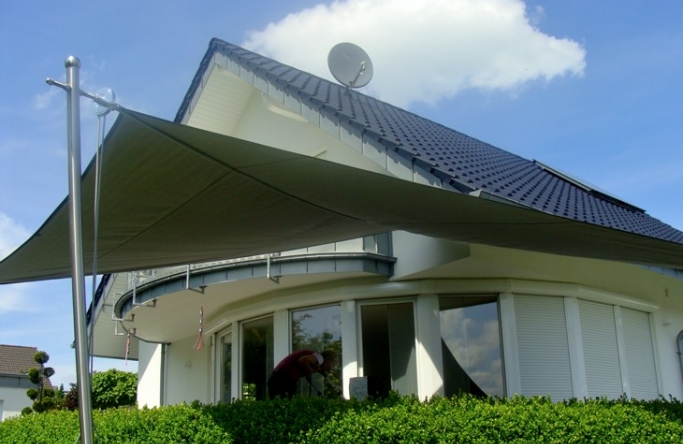 Die Möglichkeit, Sonnensegelanlagen harmonisch in die Architektur von Haus und Garten zu integrieren, kommt besonders anschaulich zur Geltung.