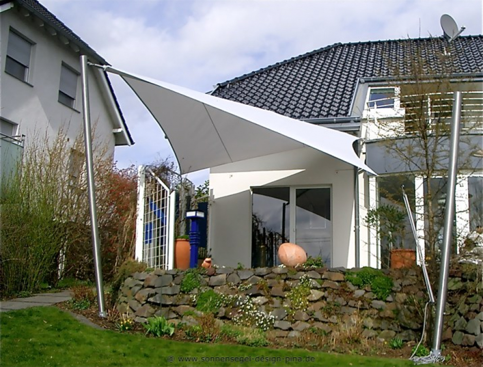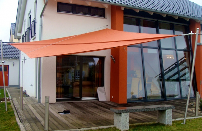 Die Möglichkeit, Sonnensegelanlagen harmonisch in die Architektur von Haus und Garten zu integrieren, kommt besonders anschaulich zur Geltung.