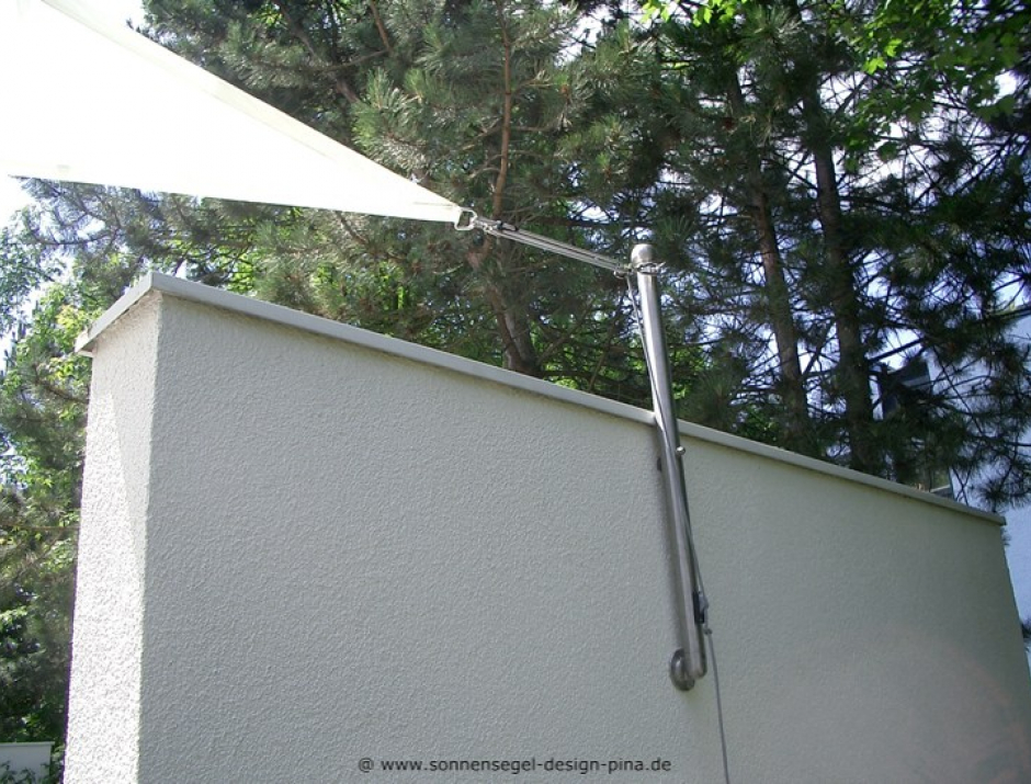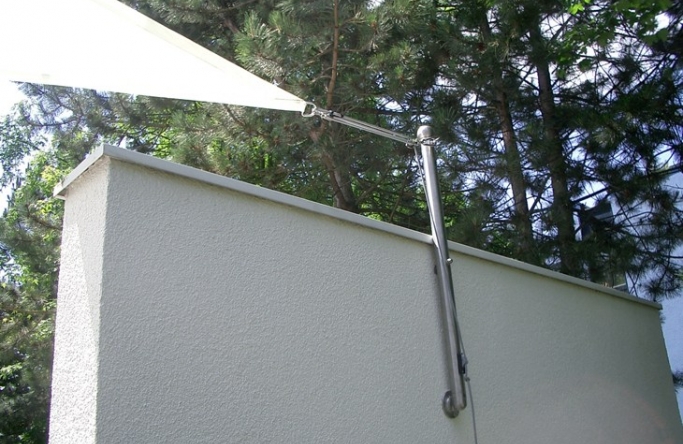 System mit 1 Masten/ 3 Wandbefestigungen / 1 Höheneinstellung. Ausgestattet mit einem wasserabweisendem Tuch aus einem acrylatbeschichtetem Polyestergewebe.