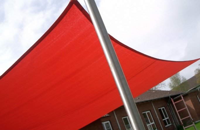 System mit 3 Masten/ 1 Wandbefestigung / 1 Höheneinstellung. Ausgestattet mit einem wasserabweisende Tuch aus einem acrylatbeschichtetem Polyestergewebe.